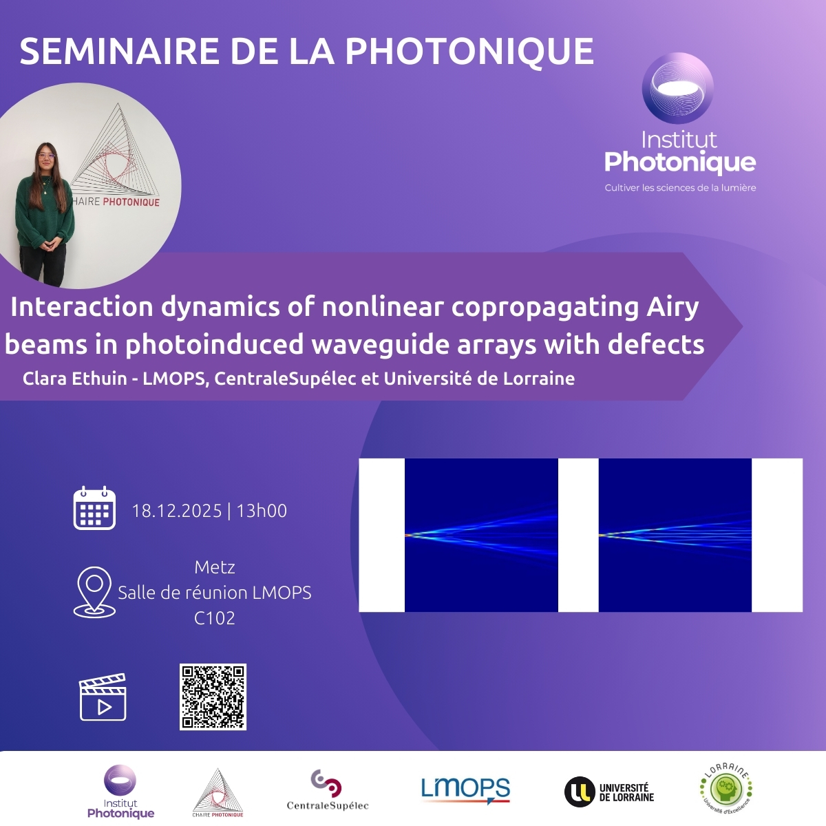 Clara Ethuin, doctorante au laboratoire LMOPS, donnera une conférence intitulée « Interaction dynamics of nonlinear copropagating Airy beams in photoinduced waveguide arrays with defects » jeudi 18 décembre à 13h00 en salle de réunion du LMOPS (aîle C).