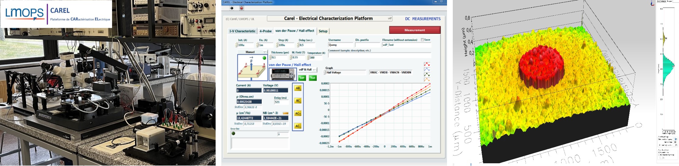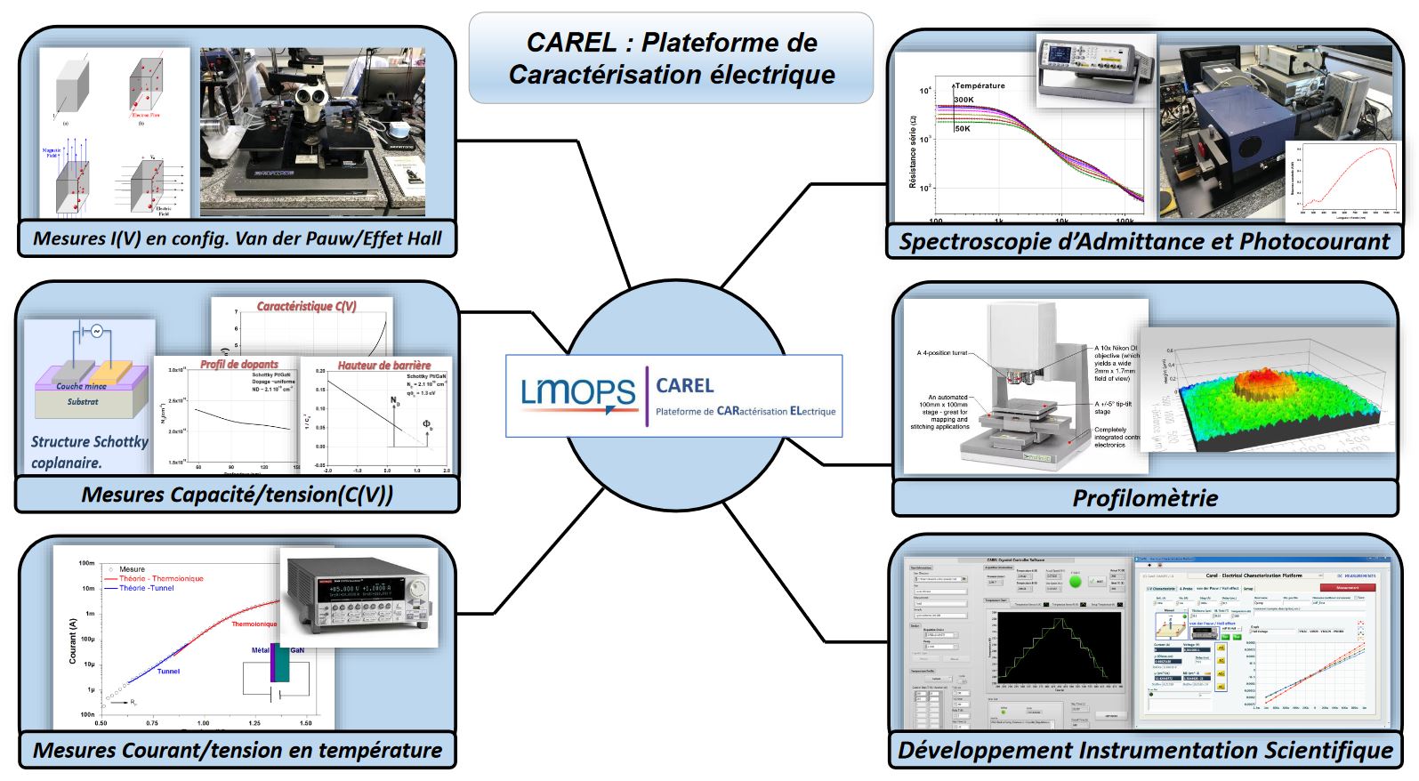 Afin de pouvoir étudier ces propriétés, le LMOPS a développé des bancs de mesure destinés à la caractérisation électrique des matériaux (principalement semi-conducteurs) regroupés au sein d’une plateforme technologique : la plateforme CAREL. Cette plateforme de caractérisation électrique (CAREL) a été conçue et mise en œuvre pour permettre l’étude et l’optimisation de matériaux et dispositifs à semi-conducteurs notamment, grâce à des techniques fiables et précises suivants une méthodologie cohérente. Les caractérisations sont, la plupart du temps, effectuées sur une couche ou un composant après une étape de traitement et de dépôt des contacts métalliques.
